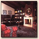 The main room, finished in wood, is richly decorated, with one wall a library full of books,